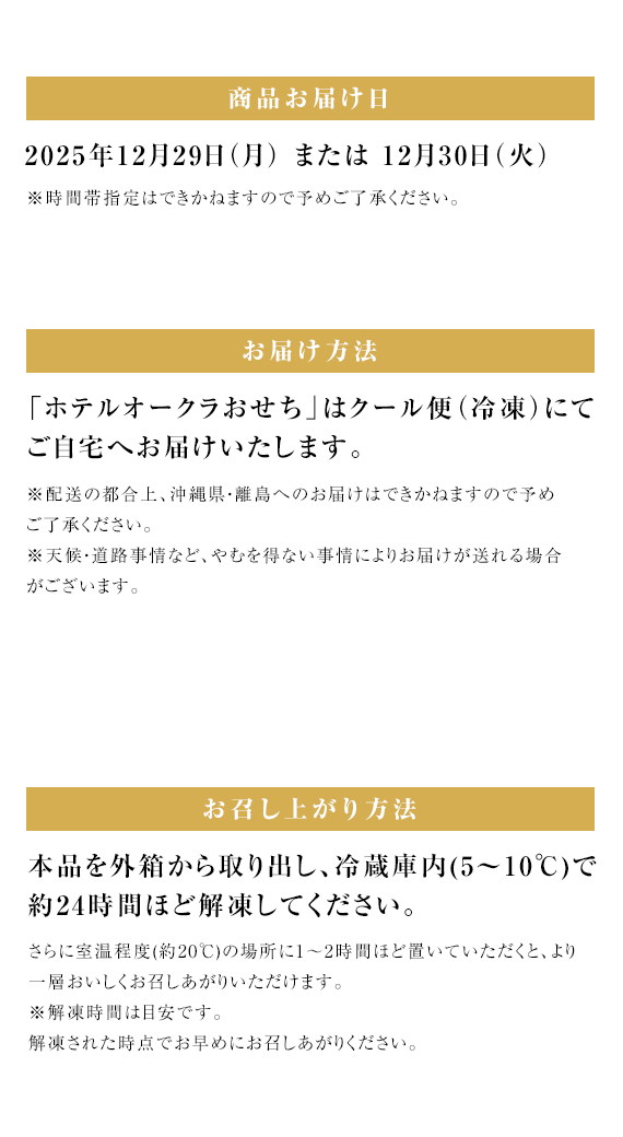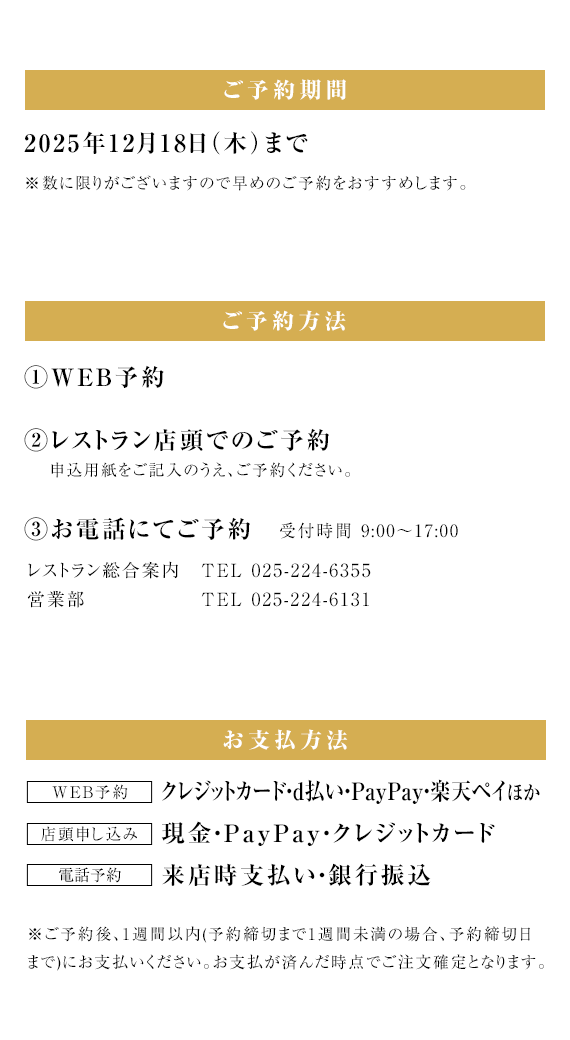 ※ご予約後、1週間以内(予約締切日まで1 週間未満の場合、予約締切日12/18まで)にお支払いください。お支払が済んだ時点で注文確定となります。