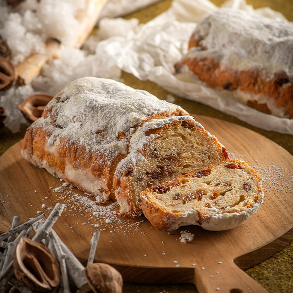 ローストアーモンドやバニラ、バター、自家製漬け込みフルーツなどを贅沢に練り込み丁寧に焼き上げました。また、程よいスパイスが、芳醇な香りを醸し出しています。クリスマスまでの期間、少しずつ熟成される変化をお楽しみください。