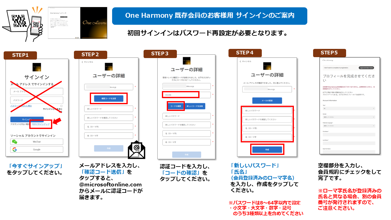 なお、すでにOne Harmony会員のお客様におかれましては、初回のご利用につきましては、新会員プログラムのもと、パスワードの再設定が必要となりますので、