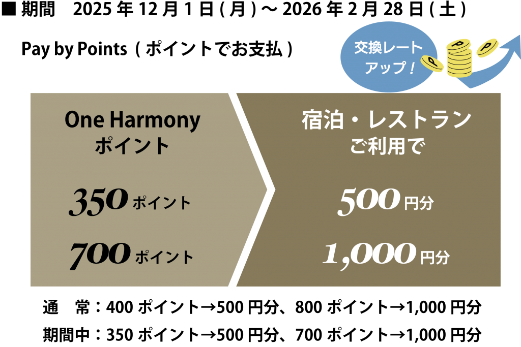 One Harmonyポイントをご宿泊、レストランでのご精算時にご利用いただける「Pay by Points」。お得なキャンペーン実施中!