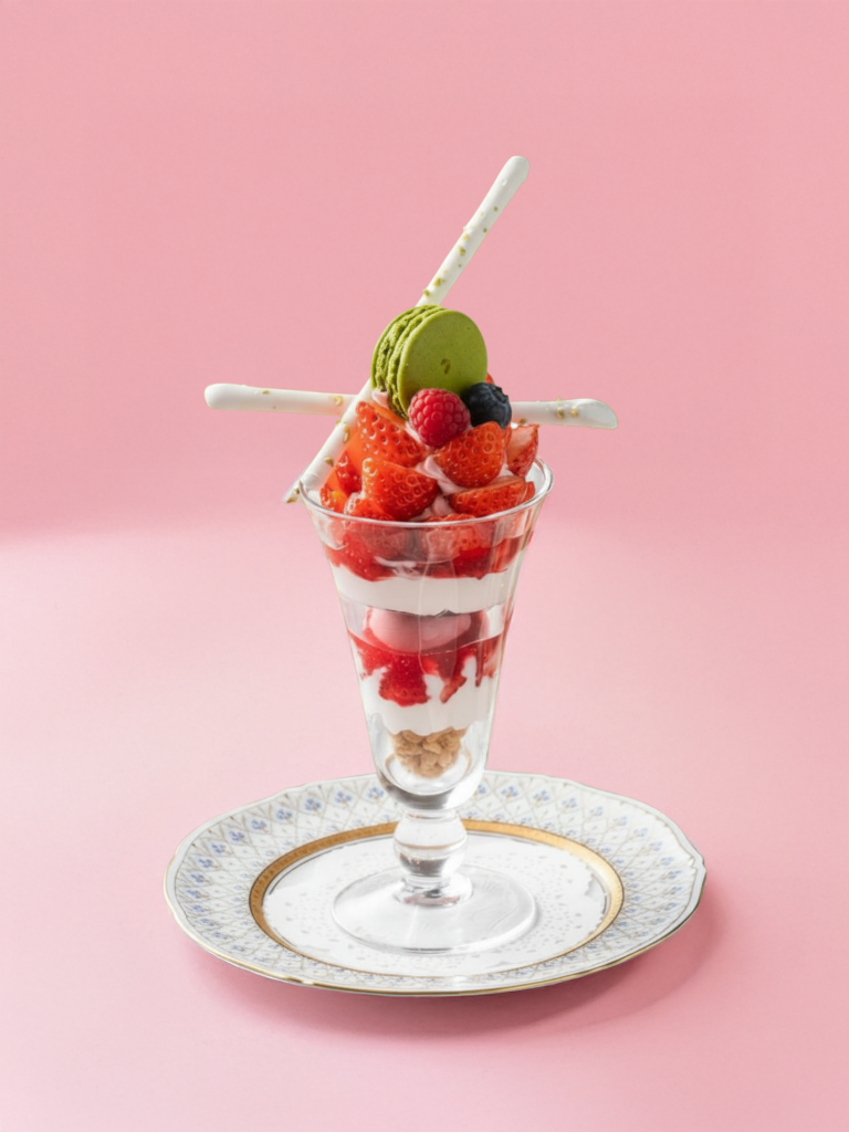さわやかな酸味のリュバーブ(西洋大黄)と甘い越後姫をパフェにしました。